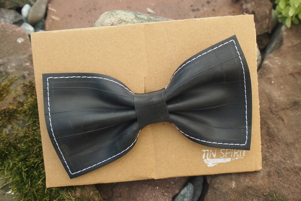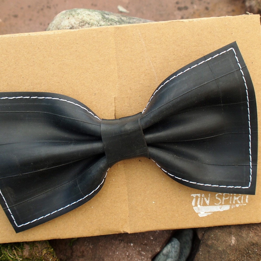 Diese Fliege wurde aus einem gebrauchten Fahrradschlauch gefertigt. Das Gummi ist doppellagig, so bleibt sie in Form. Befestigt wird sie mit einer Klammer auf der Rückseite.