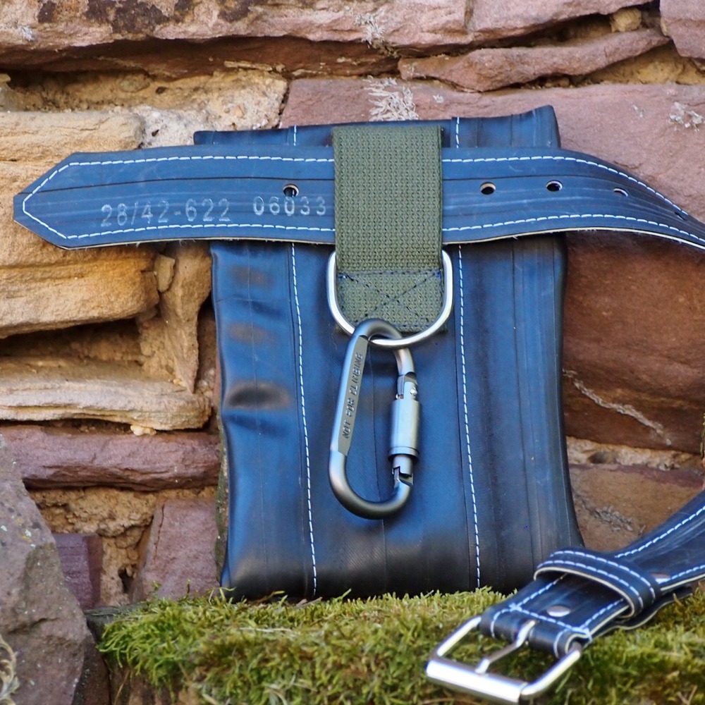 Auf der Rückseite befindet sich ein Baumwollgurt aus Armeebeständen von 1968. Durch einen Schlupf kann die Gürteltasche direkt am Gürtel befestigt werden. Eine zusätzliche Karabineraufhängung ermöglicht es die Tasche auch an Taschen, Rucksäcke oder an sonstigen Befestigungsmöglichkeiten einzuklinken.
