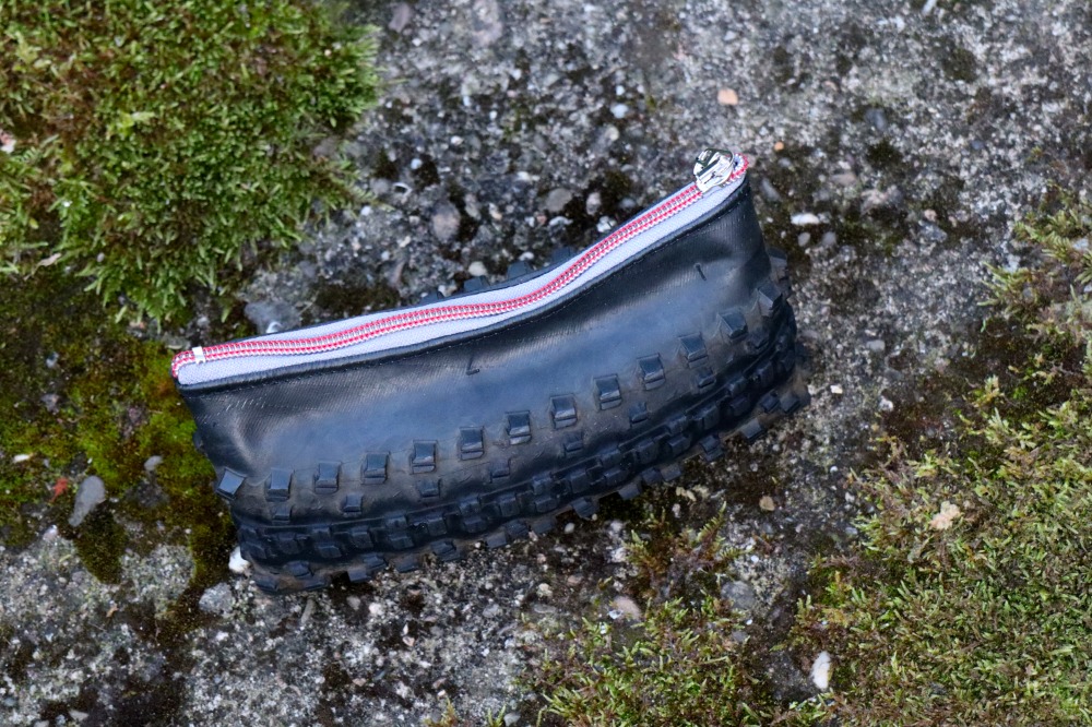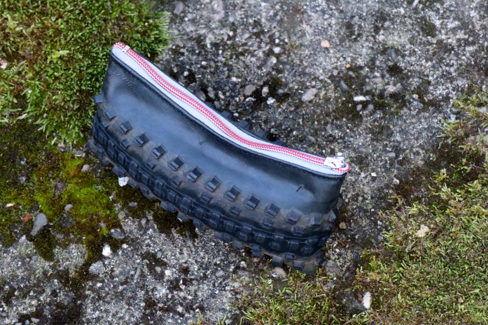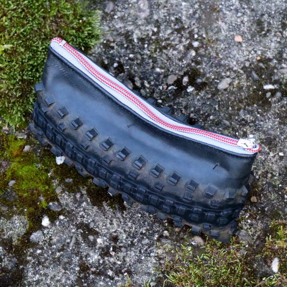 Jedes Stück ist ein echtes Unikat: sorgfältig handgefertigt aus recycelten Fahrradreifen und mit einem hochwertigen Reißverschluss ausgestattet.