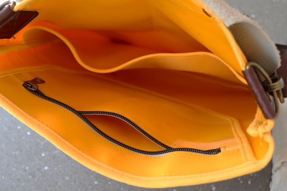 Der trapezförmige Korpus besteht aus robuster LKW-Plane und da dieses Material an sich schon sehr stabil ist, kommt TIN BAG Bleach ohne eingenähtes Futter daher. Dennoch wartet diese Tasche mit einem geschickt konzipiertem Innenleben auf: Eine von aussen unsichtbar vernähte Reißverschlusstasche und eine generelle Einteilung der Tasche in zwei Fächer, fügen viel praktischen Nutzwert hinzu.