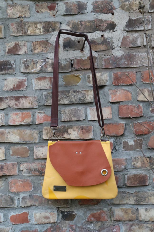 Jede dieser Taschen ist ein Unikat, in dem die individuelle Form und Farbe der Klappe mit der LKW-Plane kombiniert wurde. Die große silberne Öse im Ledermuster macht im Zusammenspiel mit den beiden kleinen Hohlnieten, an denen der verdeckte Verschluss aufgehängt ist, die Optik komplett.