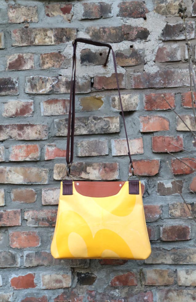 TIN BAG Bleach vereint in sich zwei für dieses Taschendesign wichtige Upcycling-Materialien: LKW-Plane und Polstermuster aus Leder. Letztere dienen als Klappe, die in ihrer freien, amorphen Form diesen Taschen ihre charakteristische Erscheinung verleihen. Assoziationen zu Kunst- und Designstilen der 60er Jahre, aber auch zur Musik der Beat-Generation tuen sich auf.