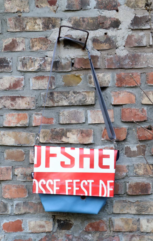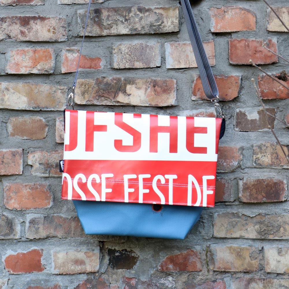 Der austauschbare Trageriemen aus farbigem Sicherheitsgurt kann entweder als bewusster Farbakzent oder zurückhaltend gewählt werden. Somit ist diese Tasche vielseitig einsetzbar, sei es für einen kleinen unvorhergesehenen Einkauf oder als unverwüstliche Allzwecktasche auf einem Festival.