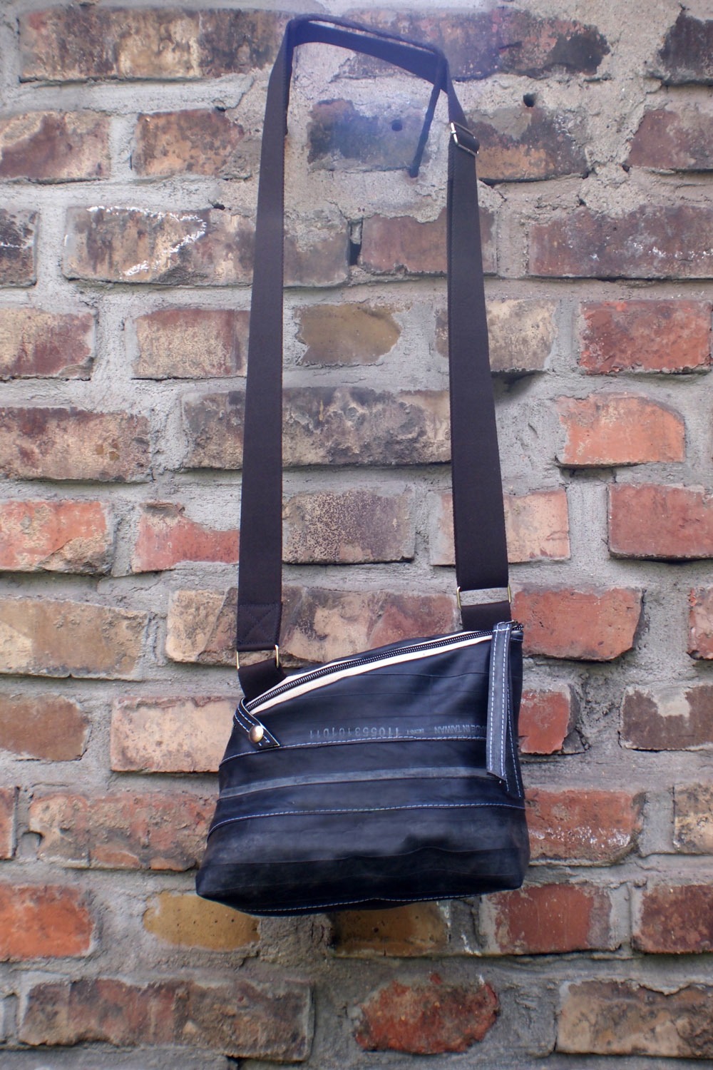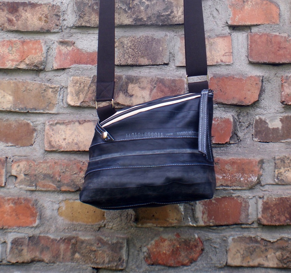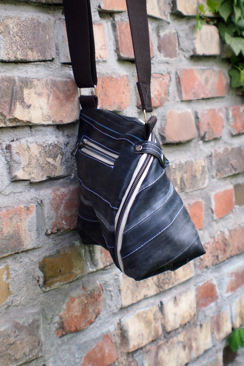 Diese Tasche ist aus strapazierfähigem Fahrradschlauch gefertigt. Sie kann durch einen Reißverschluss bis zum Boden geöffnet werden. Doch damit die TIN BAG Two geschützt ist, gibt es durch einen Druckknopf eine kleine Reißverschluss-Sicherung.